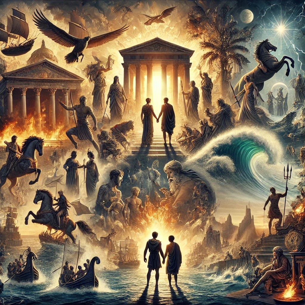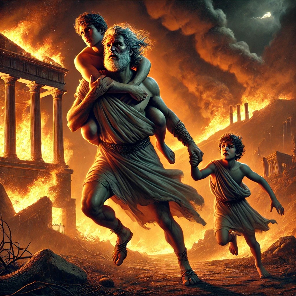 Die Aeneis von Vergil erzählt die sagenhafte Flucht des trojanischen Helden Aeneas nach dem Untergang Trojas. Geleitet von göttlicher Vorsehung durchläuft er zahlreiche Prüfungen: die Irrfahrten auf dem Meer, Begegnungen mit göttlichen Mächten und Prophezeiungen seiner Zukunft. Schließlich erreicht er Italien, wo er die Grundlagen für das spätere römische Volk legt. Die Erzählung verbindet heroische Abenteuer mit göttlicher Fügung und gründet in der römischen Tradition das Bild von Pflicht, Tapferkeit und Schicksal. (ChatGPT)