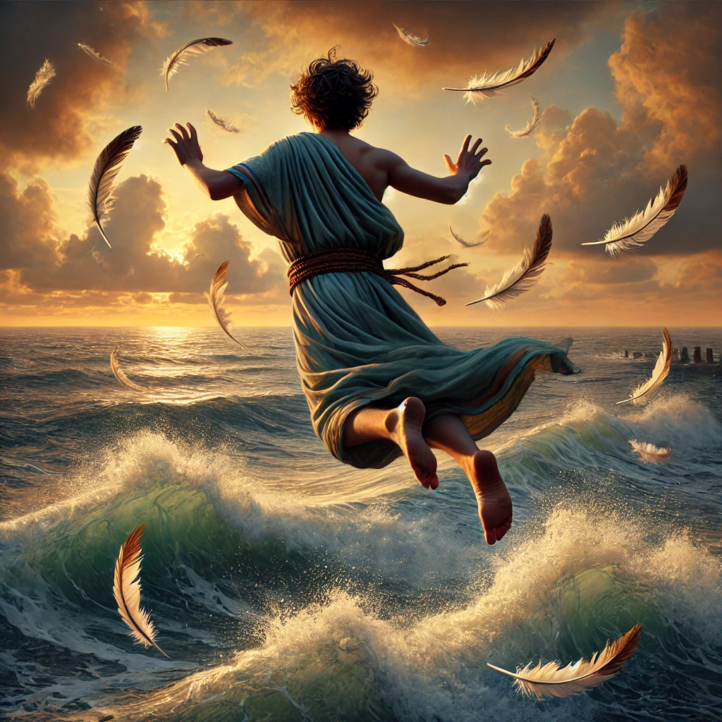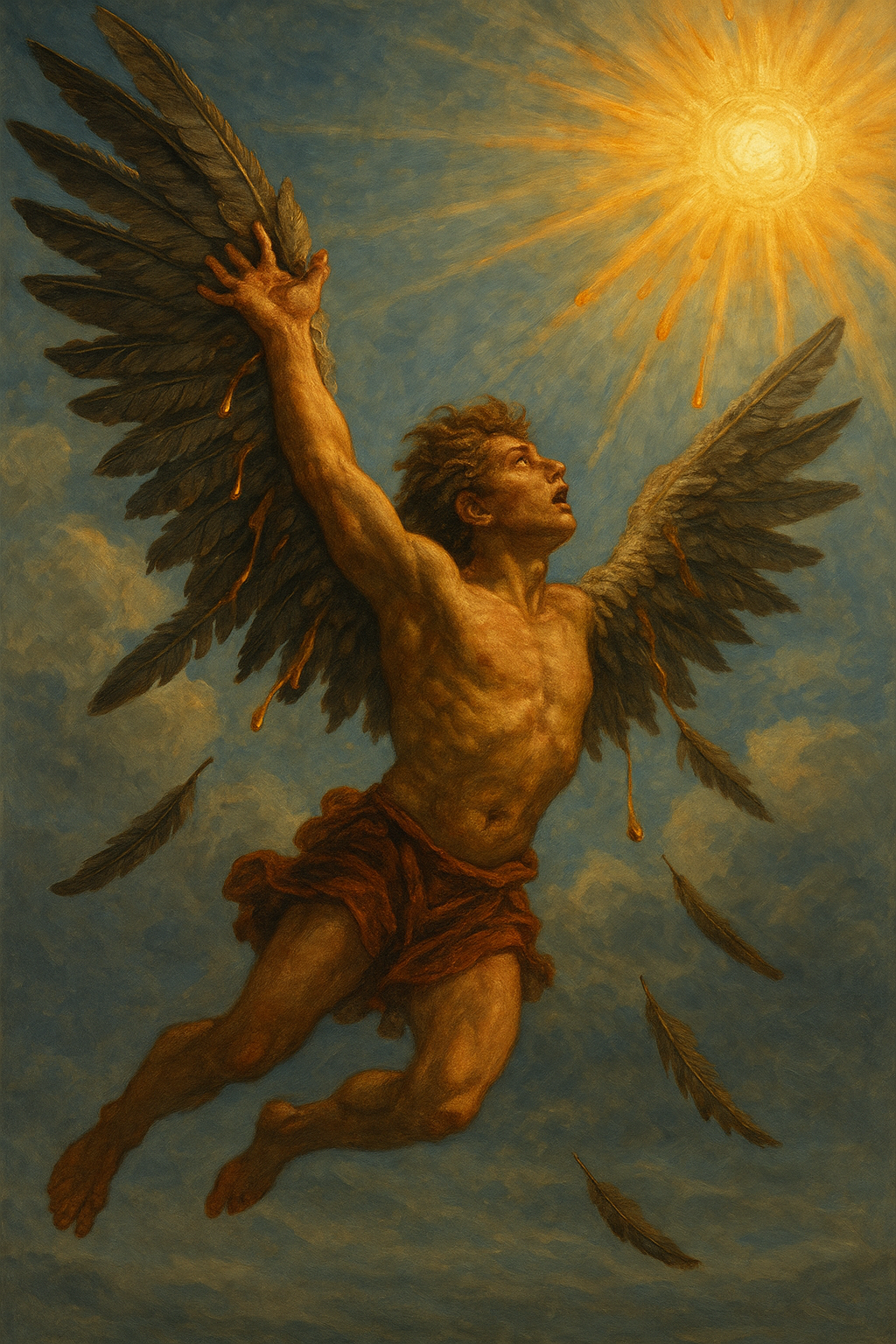 Daidalos war ein genialer Erfinder und Handwerker in der griechischen Mythologie, bekannt für seine geschickten Konstruktionen, darunter das Labyrinth auf Kreta, in dem der Minotaurus gefangen gehalten wurde. Um zusammen mit seinem Sohn Ikaros von der Insel zu entkommen, baute er Flügel aus Federn und Wachs. Trotz der Warnungen seines Vaters flog Ikaros zu hoch zur Sonne, das Wachs schmolz, und er stürzte ins Meer. Die Sage mahnt vor Übermut (Hybris) und zugleich vor der Bedeutung von Maß und Vernunft. (ChatGPT)