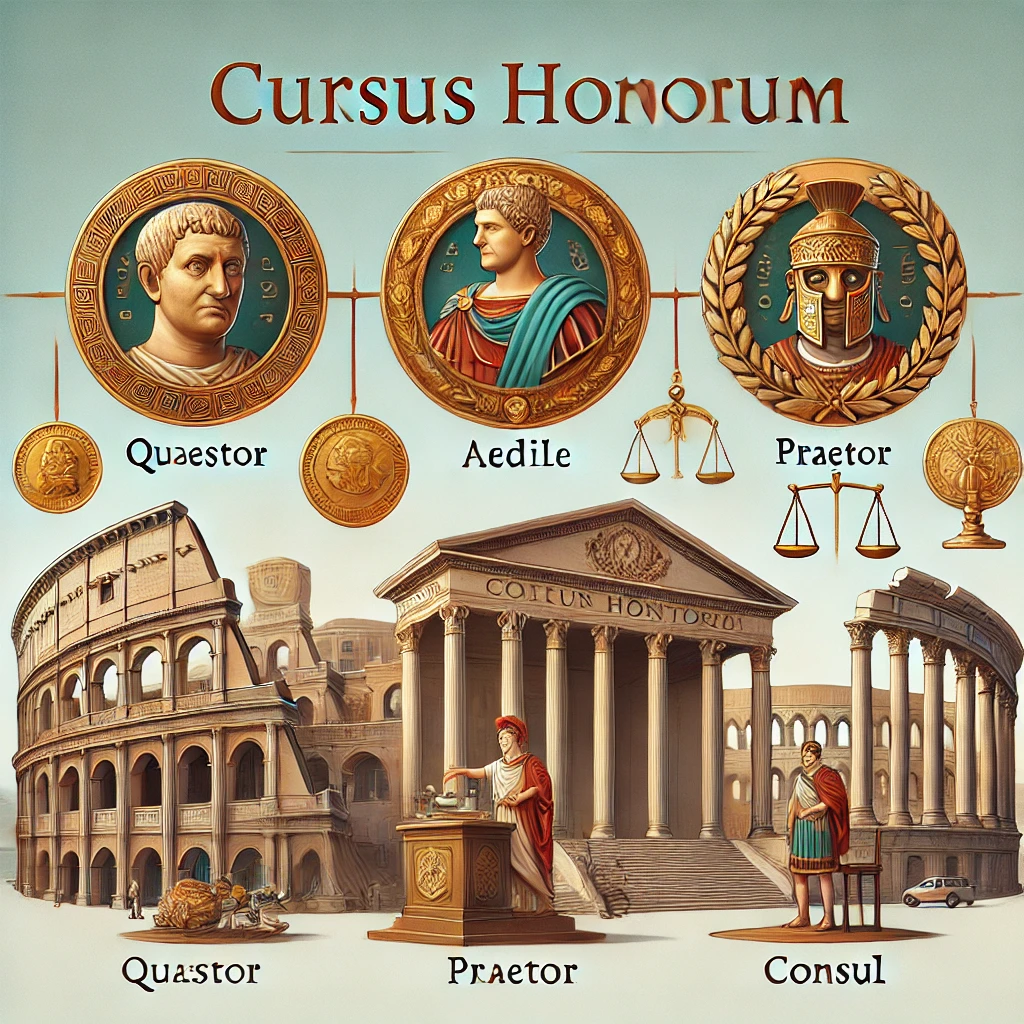 Der Cursus Honorum bezeichnete im antiken Rom die festgelegte Reihenfolge politischer Ämter, die ein römischer Bürger – insbesondere aus dem Patrizier- oder Oberschichtstand – durchlaufen musste, um höchste Positionen zu erreichen. Typischerweise begann die Karriere mit niederen Ämtern wie Quaestor, gefolgt von Aedil, Praetor und schließlich Consul. Zwischen den Ämtern gab es oft vorgeschriebene Wartezeiten, und militärische Erfahrung war häufig Voraussetzung. Der Cursus Honorum regelte Machtaufstieg, Ehrungen und das Prestige innerhalb der römischen Republik und sollte sicherstellen, dass erfahrene und prüfbare Persönlichkeiten an die Spitze der politischen Hierarchie gelangten. (ChatGPT)