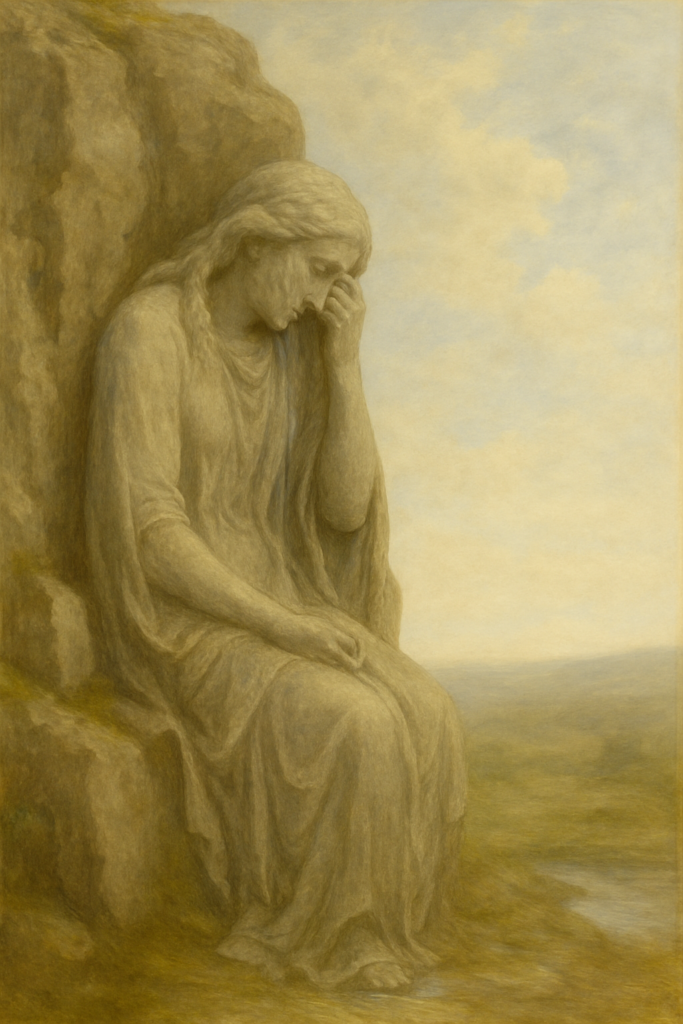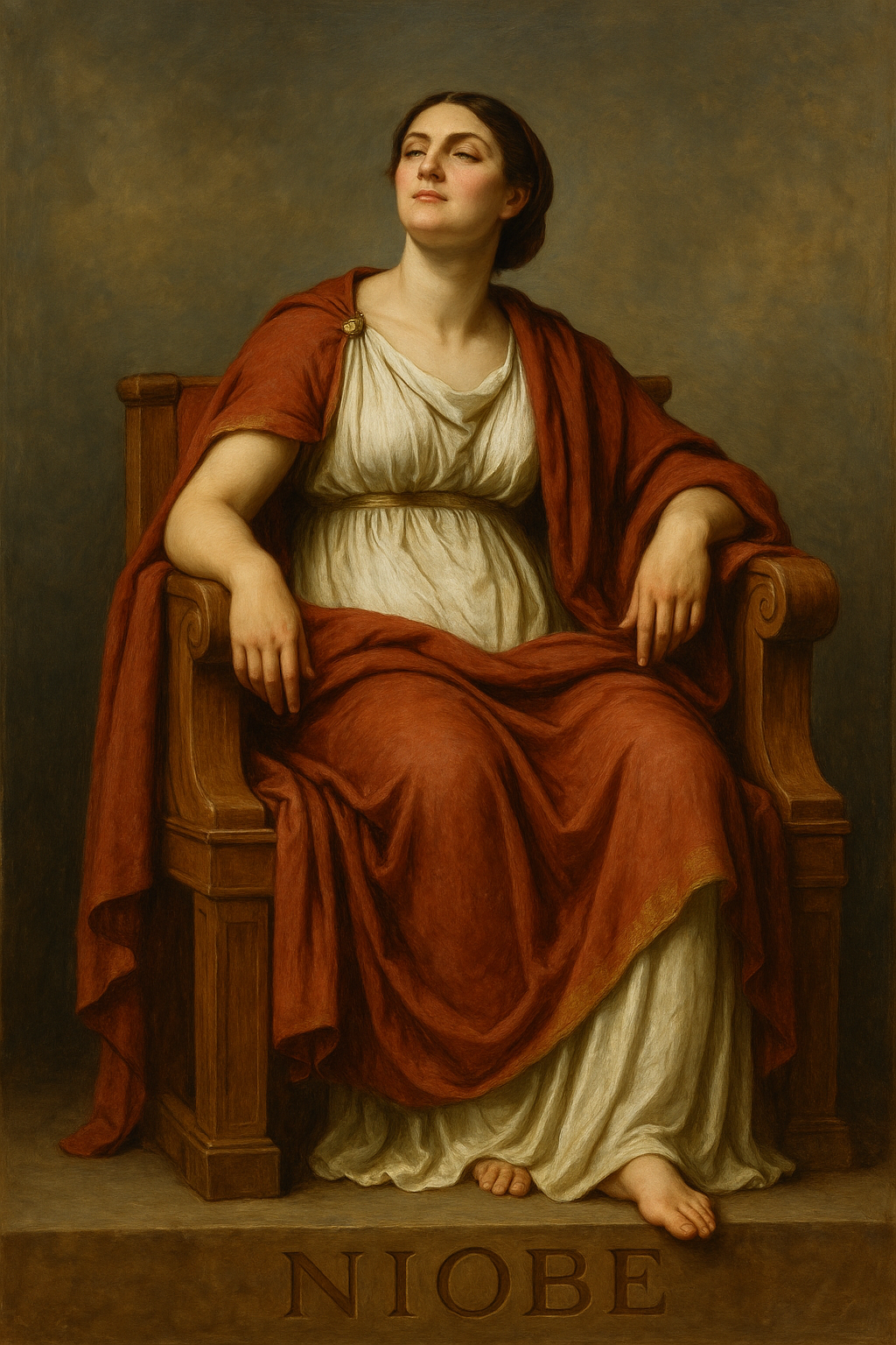 Niobe war laut griechischer Sage die Tochter von Tantalos und Königin von Theben. Stolz auf ihre vielen Kinder (je nach Version 6–14) rühmte sie sich über Leto, die nur zwei Kinder, Apollon und Artemis, hatte. Aus Zorn über diesen Hochmut töteten Apollon und Artemis alle Kinder Niobes. Von Schmerz und Trauer überwältigt, floh Niobe auf einen Berg, wo sie laut Mythos zu Stein erstarrte, während ewige Tränen aus ihrem Gesicht flossen. Die Geschichte gilt als Warnung vor Hybris und der Missachtung der Götter. (ChatGPT)